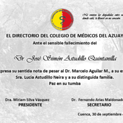 El Directorio del Colegio de Médicos del Azuay expresa la más sentida nota de pesar ante el sensible fallecimiento del Dr. José Simón Astudillo Quintanilla.