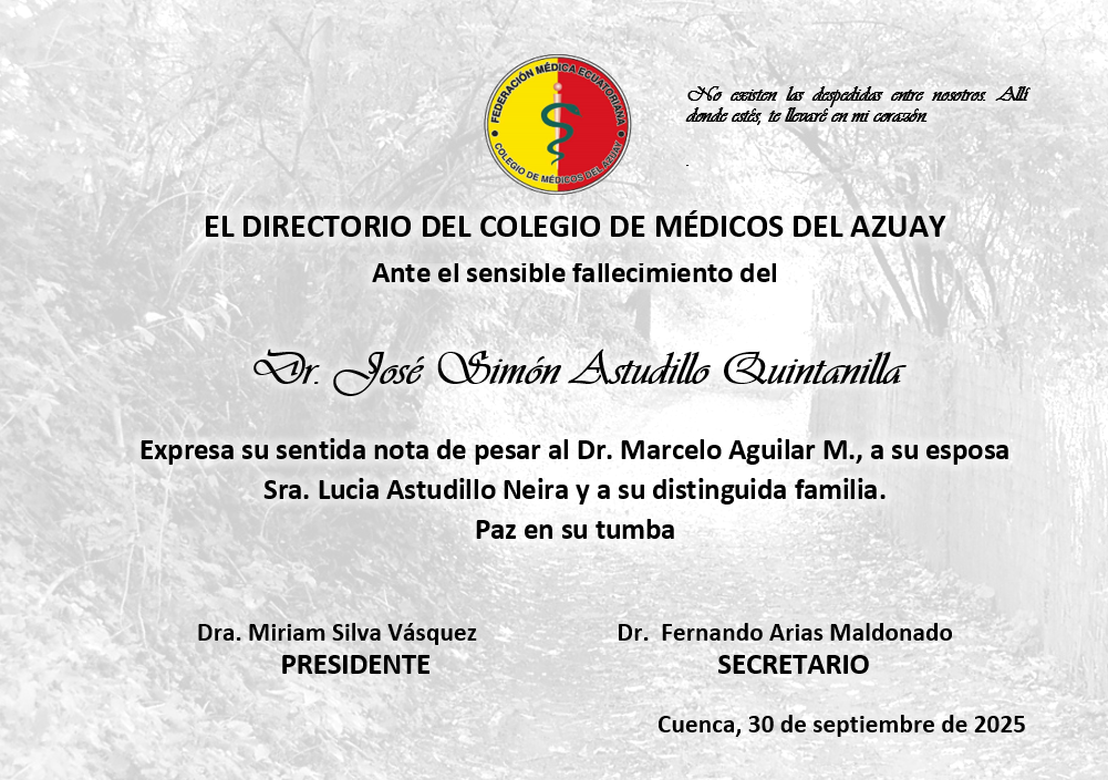 El Directorio del Colegio de Médicos del Azuay expresa la más sentida nota de pesar ante el sensible fallecimiento del Dr. José Simón Astudillo Quintanilla.