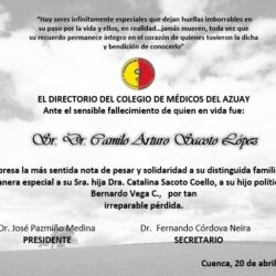 Hacemos llegar nuestra sentida nota de pesar a todos sus familiares y amigos, de manera especial a su hijo Dr. Carlos Arias Pesantez, nos solidarizamos ante tan irreparable pérdida.