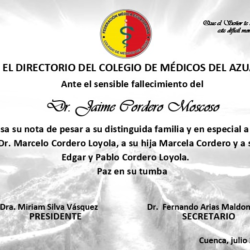 El Directorio del Colegio de Médicos del Azuay expresa la más sentida nota de pesar ante el sensible fallecimiento del Dr. Jaime Cordero Moscoso.