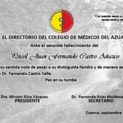 El Directorio del Colegio de Médicos del Azuay expresa la más sentida nota de pesar ante el sensible fallecimiento del Psicól. Juan Fernando Castro Añazco.
