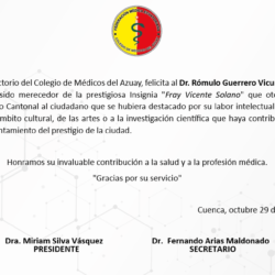 El Directorio del Colegio de Médicos del Azuay expresa la más sentida nota de pesar ante el sensible fallecimiento del Sr. Norberto Aurelio Álvarez Mosquera.